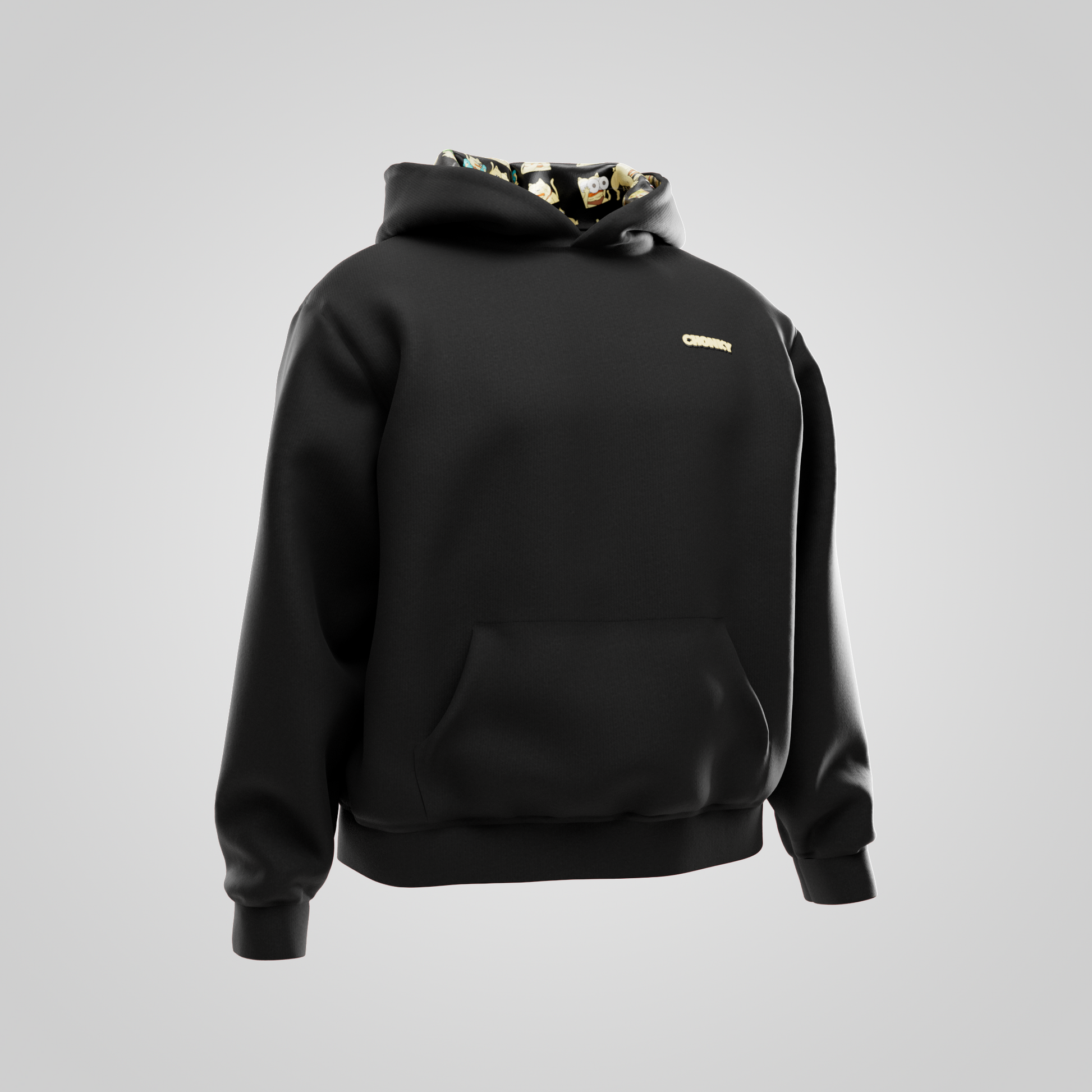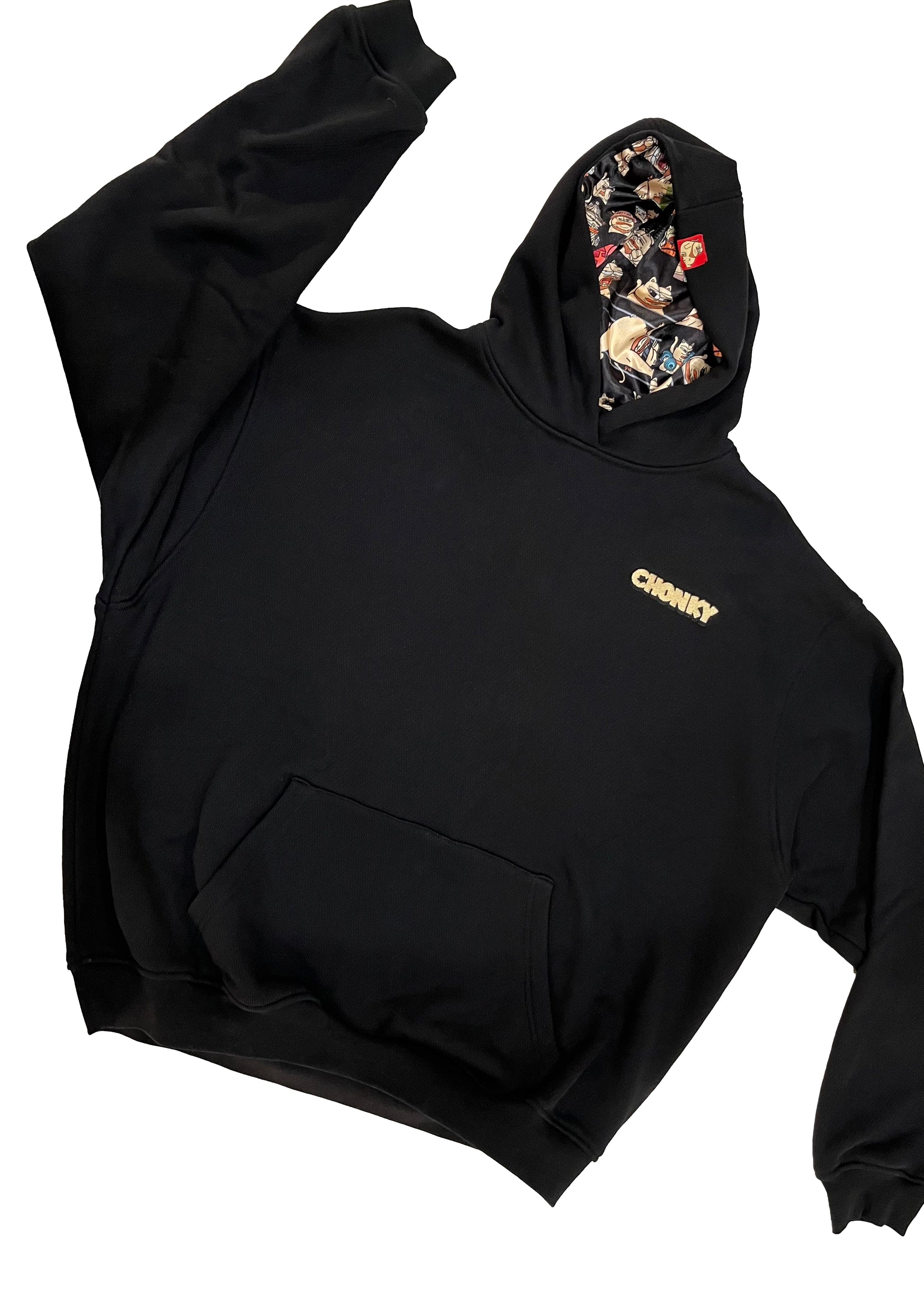 The hood and pocket are lined in silk, which has been printed with a Chonky meme-pattern, making each hoodie unique.