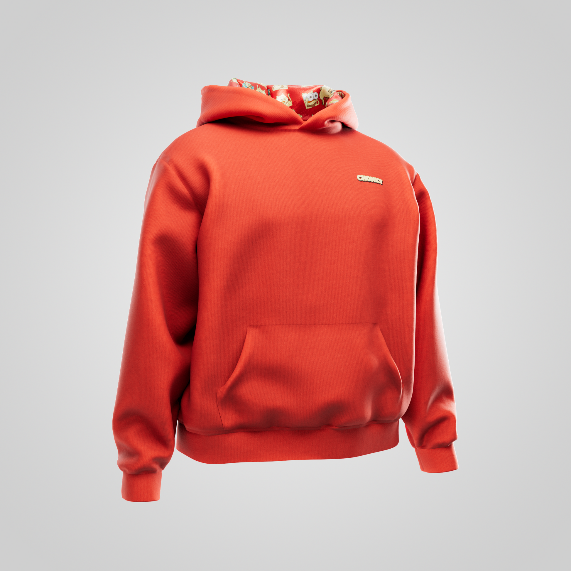 The hood and pocket are lined in silk, which has been printed with a Chonky meme-pattern, making each hoodie unique.