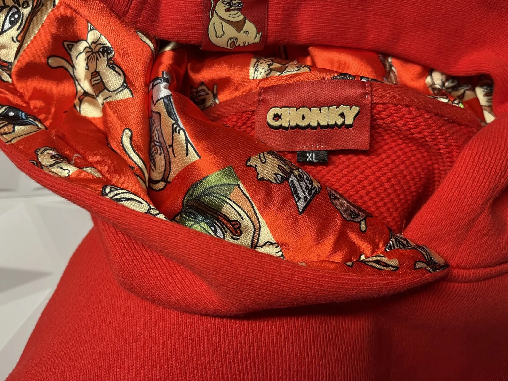 Rep Chonky anywhere with this premium, oversized, hoodie. Super thick, 620GSM 100% Combed Cotton French-Terry material will make you feel like the fat cat himself is wrapped around you in a big, Chonky-sized hug. Premium ribbing at the wrists and waist for extra comfort and fit. Postwork process done to ensure maximum feel and Chonkiness.