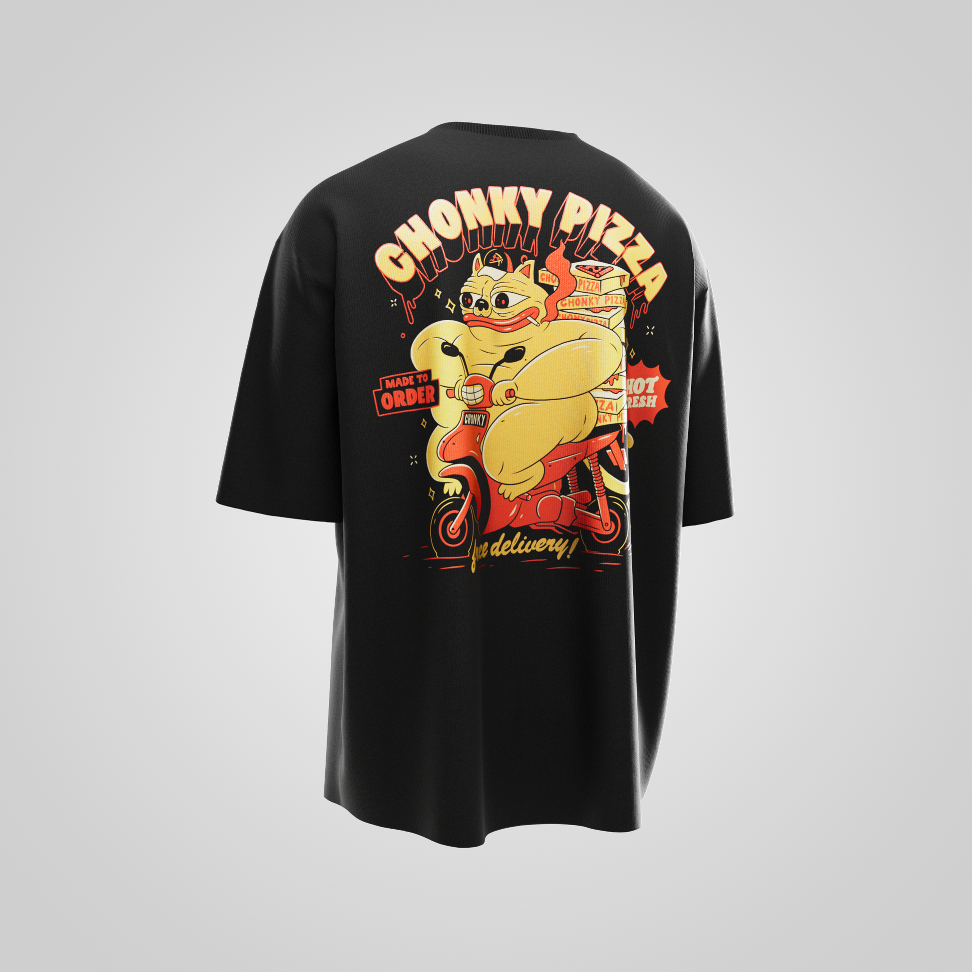 Rep the fat cat with this streetwear-inspired, oversized fit t-shirt. Embroidered logo on the front chest, with bold printed Chonky Pizza graphic on the back. Extra thick (310 GSM), ultra-soft 100% combed cotton tee with dropped shoulders and longer sleeves to finish off the Chonky look.