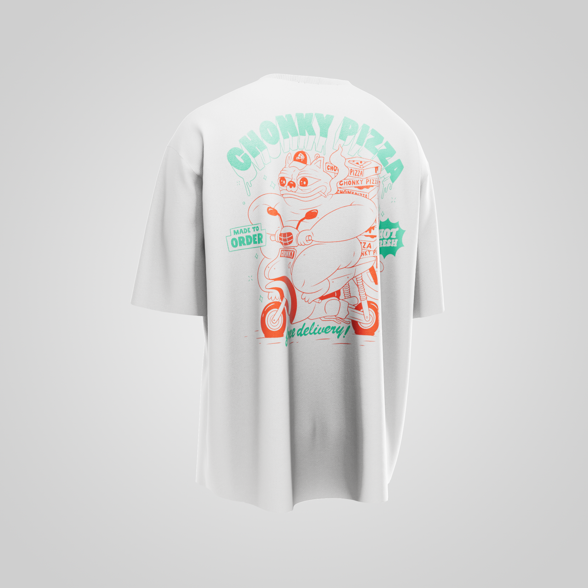 Rep the fat cat with this streetwear-inspired, oversized fit t-shirt. Embroidered logo on the front chest, with bold printed Chonky Pizza graphic on the back. Extra thick (310 GSM), ultra-soft 100% combed cotton tee with dropped shoulders and longer sleeves to finish off the Chonky look.