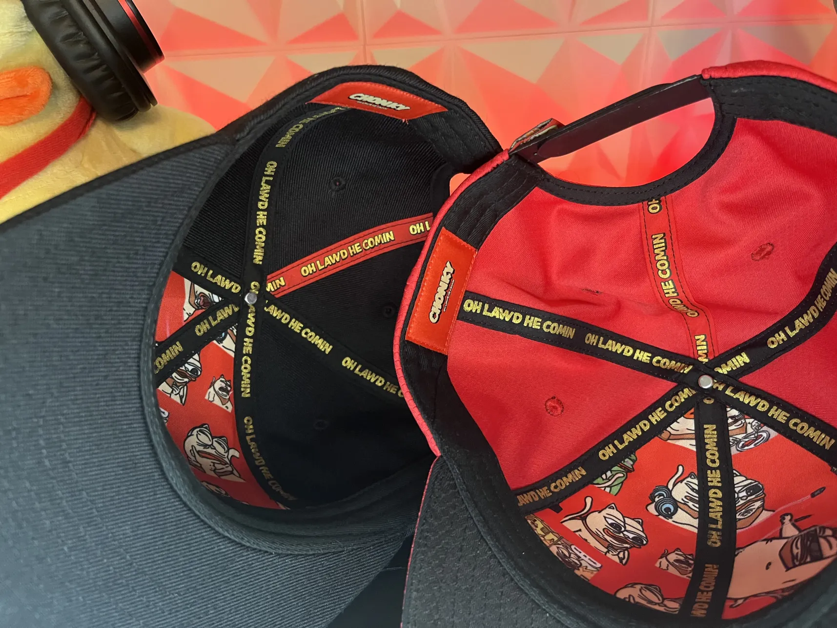 Soft meme-covered inner liner and custom piping on the inside make this hat as unique and special as Chonky himself.